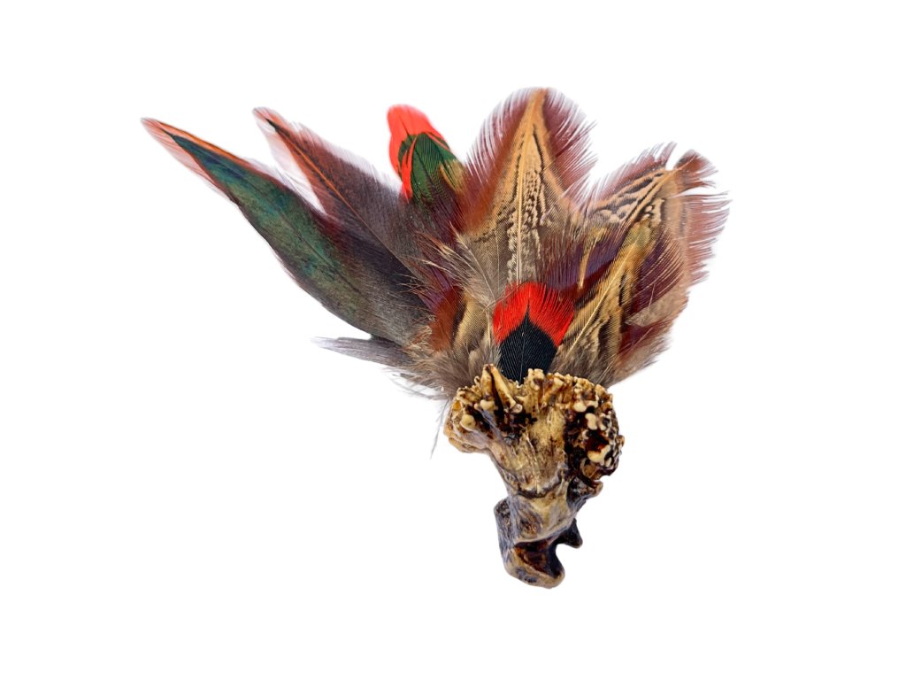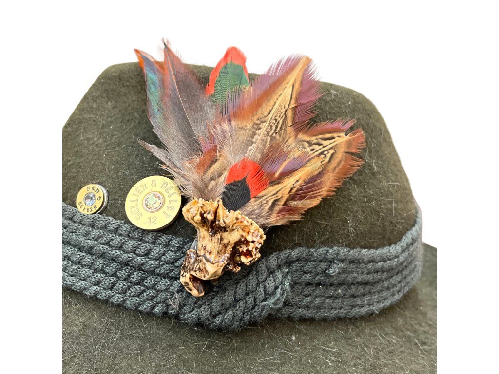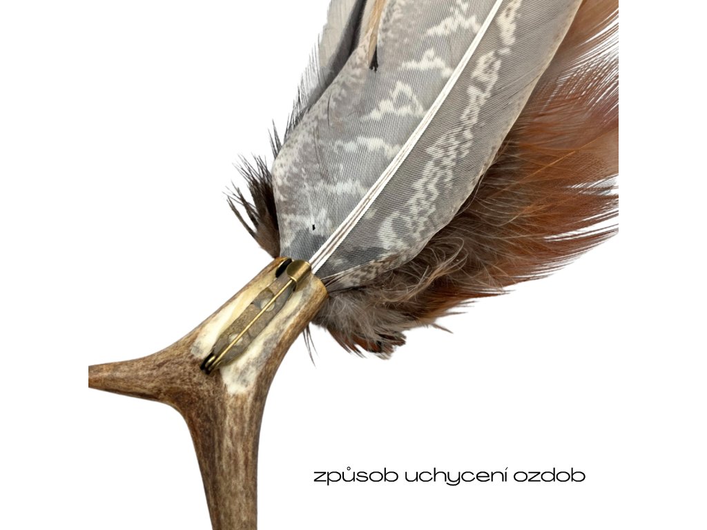Ozdoba - brož na klobouk z paroží a přírodního peří.