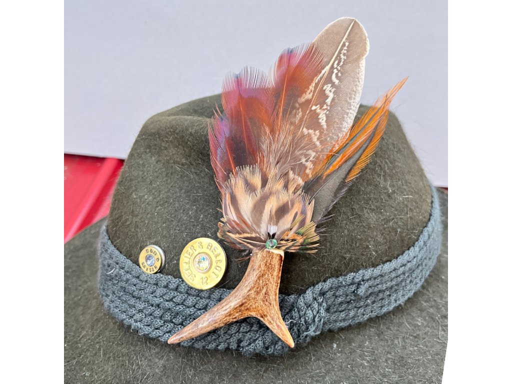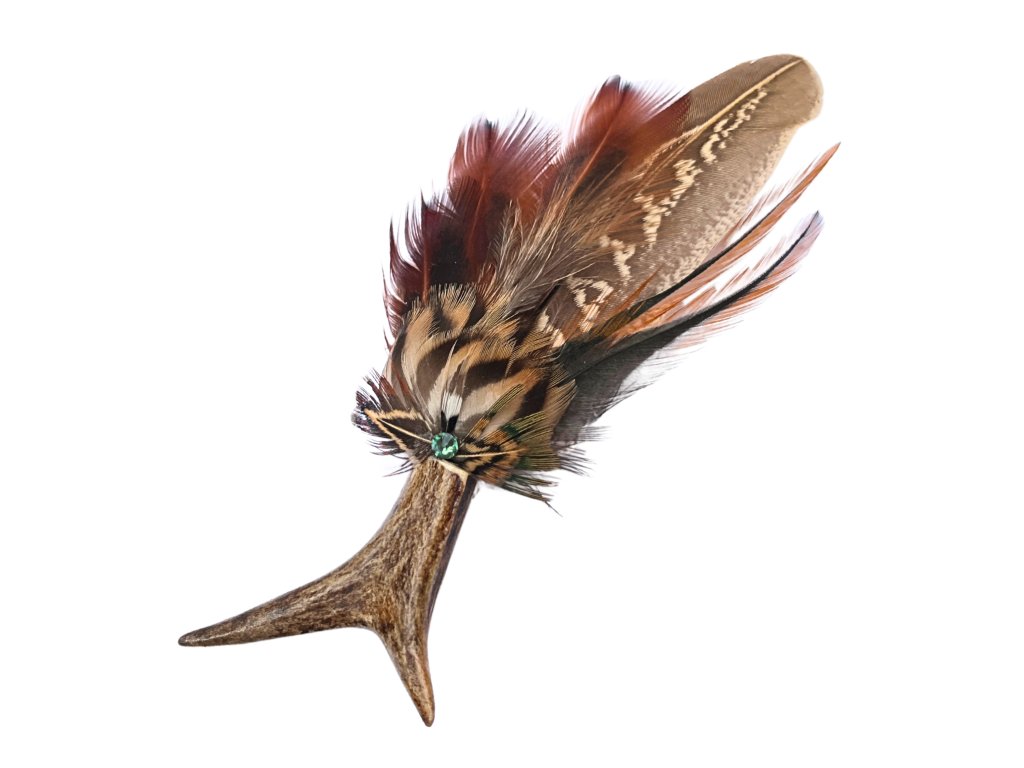 Ozdoba - brož na klobouk z paroží a přírodního peří.