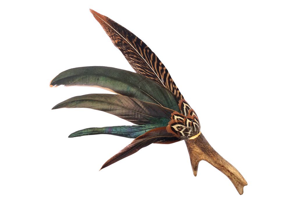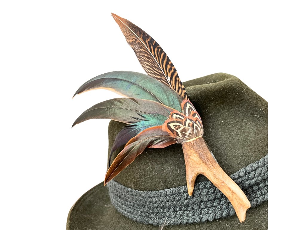 Ozdoba - brož na klobouk z paroží a přírodního peří.