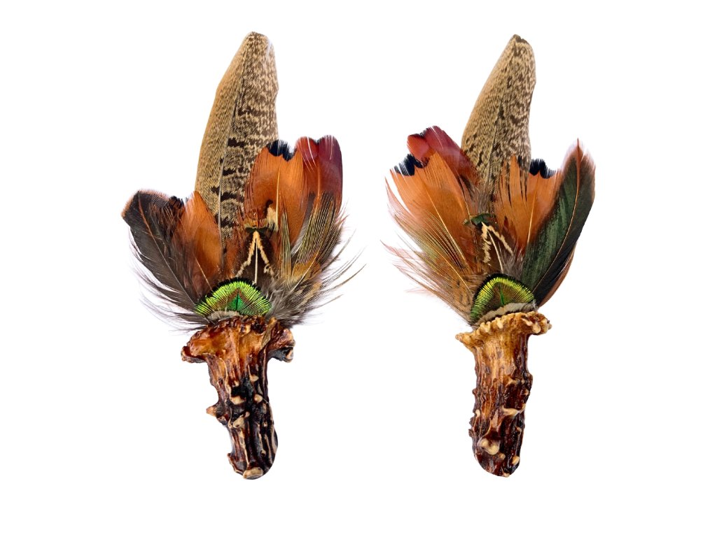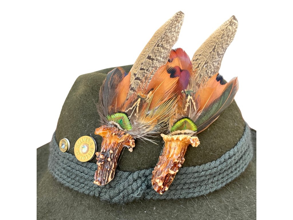 Jedinečný pár ozdob na klobouk z paroží a přírodního peří.