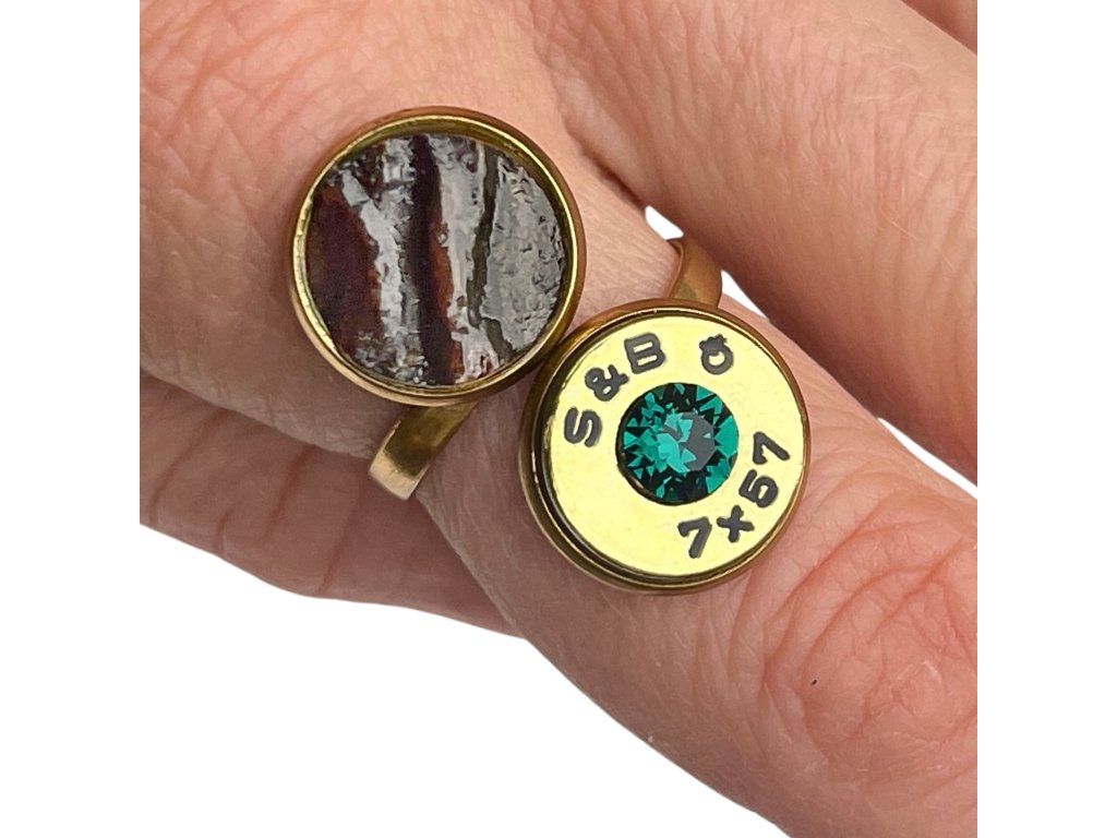 Unikátní prsten nastavitelné velikosti ve zlaté barvě s reálnou nábojnicí o průměru nad 10 mm a parožím. Možnost vsazení krystalů Swarovski pro přidaný lesk.Ideální pro milovníky střelecké kultury a moderního designu.