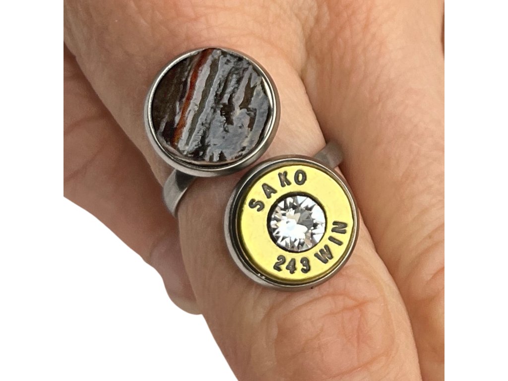 Vstupte do světa originálního designu a precizní rukodělné výroby s tímto prstenem z chirurgické oceli s reálnou nábojnicí a parožím. Každý prsten je vyroben z části skutečných nábojnic o průměru nad 10 mm, které byly pečlivě zpracovány a upraveny pro dokonalý vzhled.